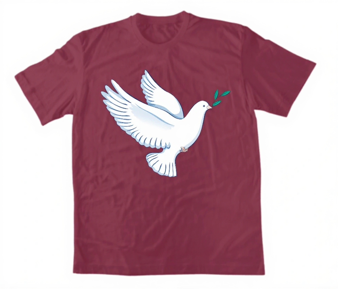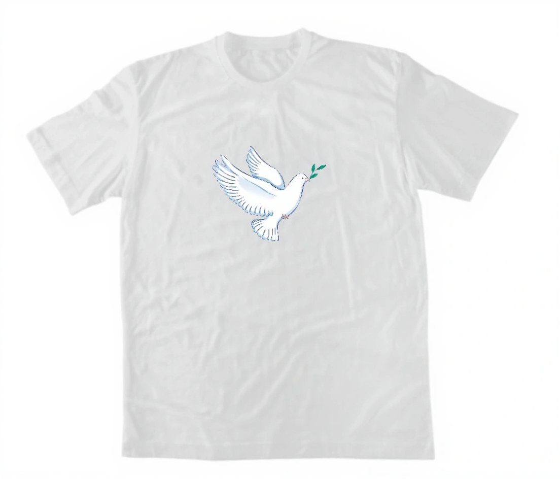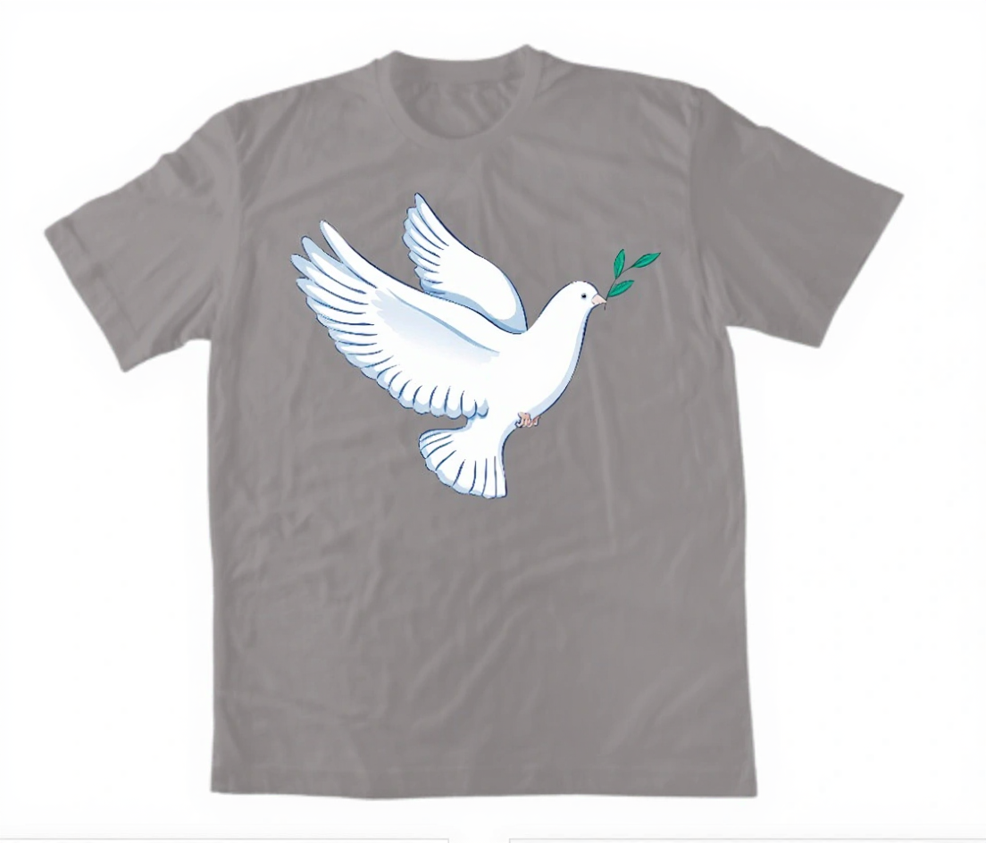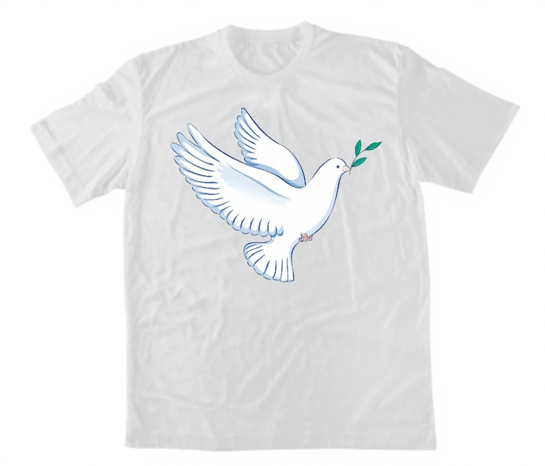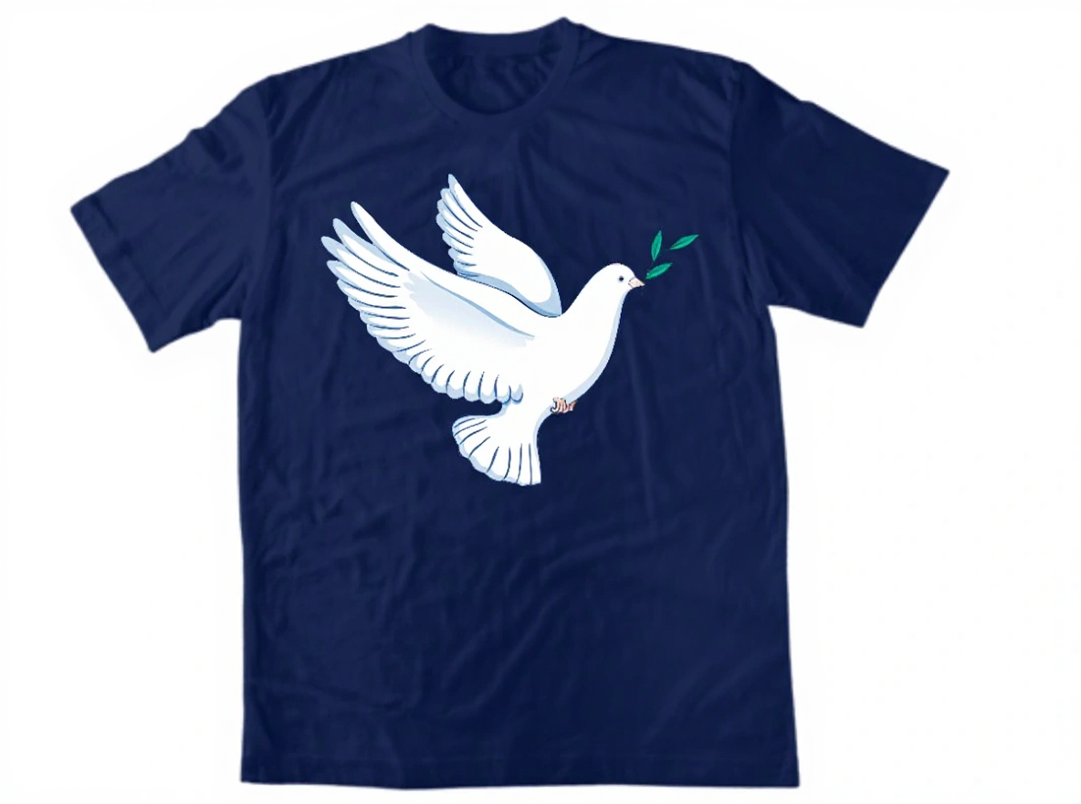 Красив минималистичен дизайн с гълъб – символ на Светия Дух и мира. Бял гълъб с маслинова клонка върху черен фон, създаващ впечатляващ контраст. 100% памук.