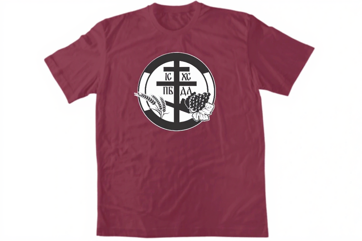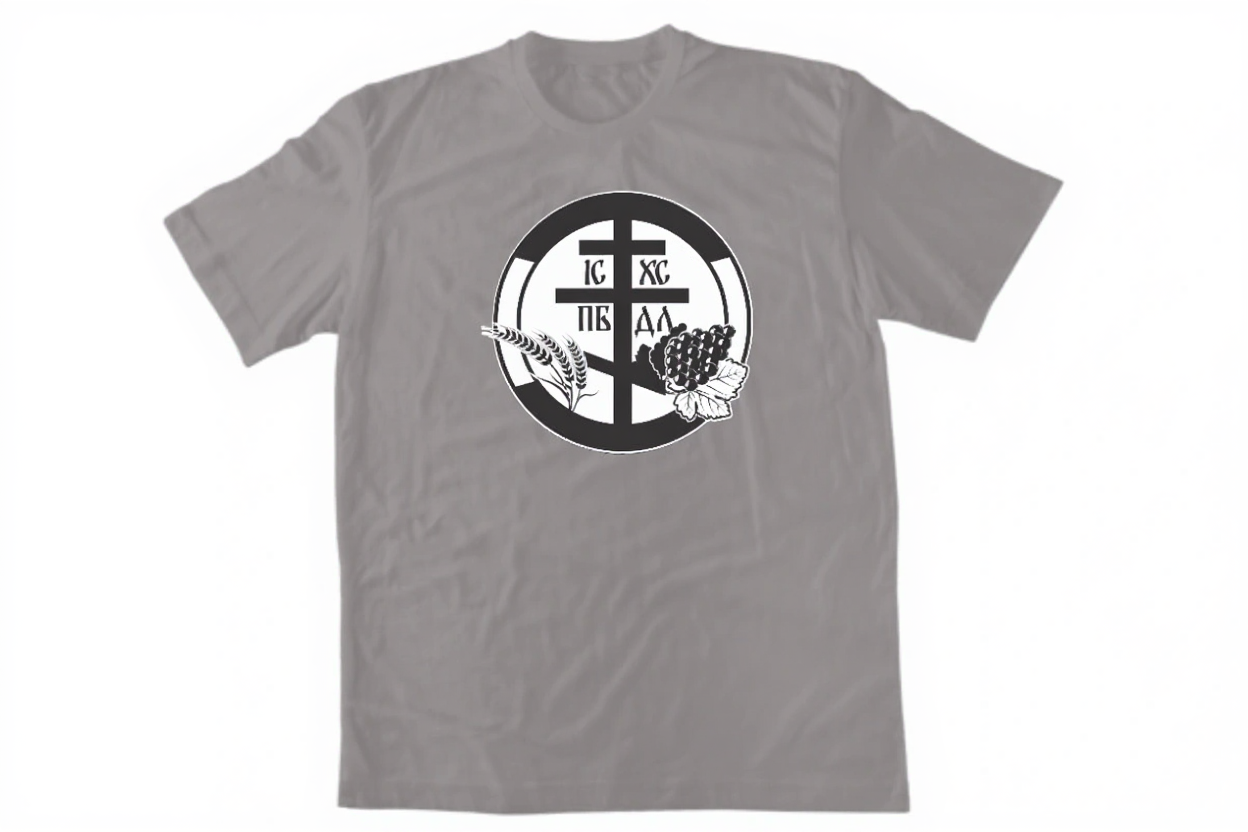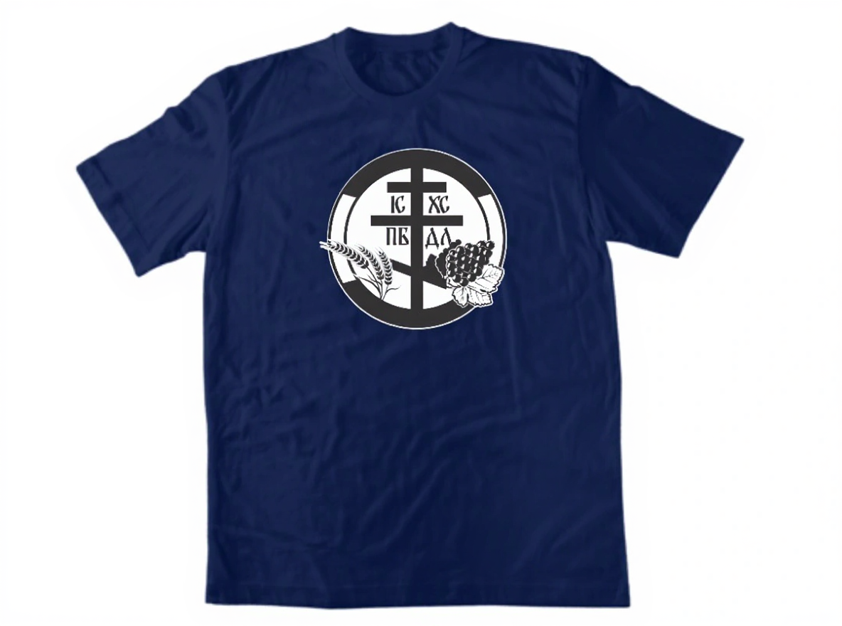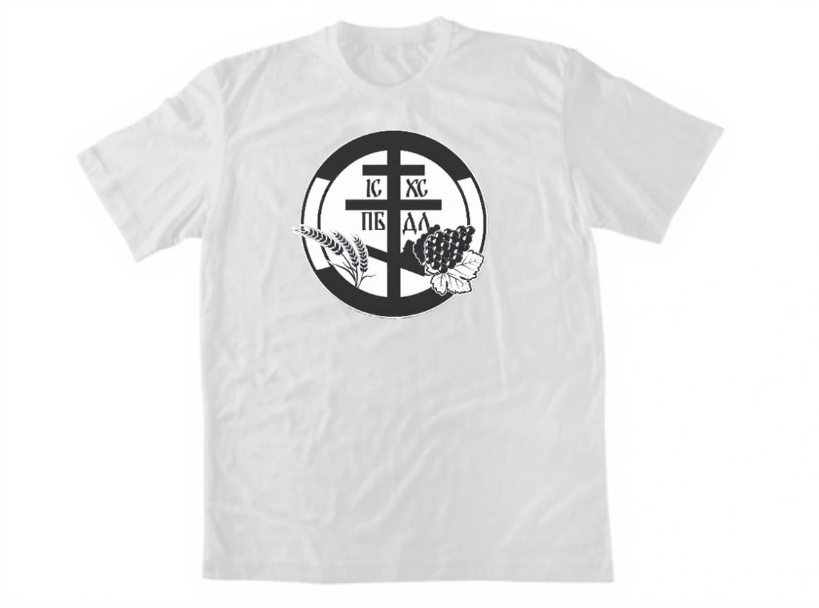 Мощен православен дизайн с кръг, съдържащ кръста и надписа IC XC NIKA, заобиколен от молитвени ръце и лозови клонки – символи на причастието. 100% памук от Пловдив.